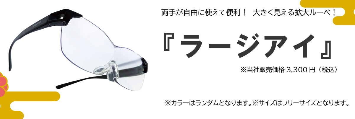 ○ 『拡大ルーペ ラージアイ』『PCサングラス』の外箱は商品保護用の物であり郵送の状況によって多少つぶれる場合もございます。